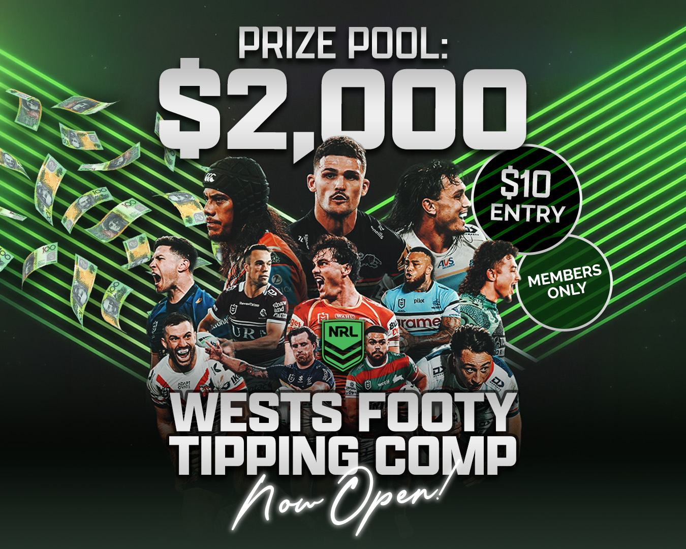 Our NRL Footy Tipping Competition is now open, exclusively for full financial members of Wests Entertainment Group!