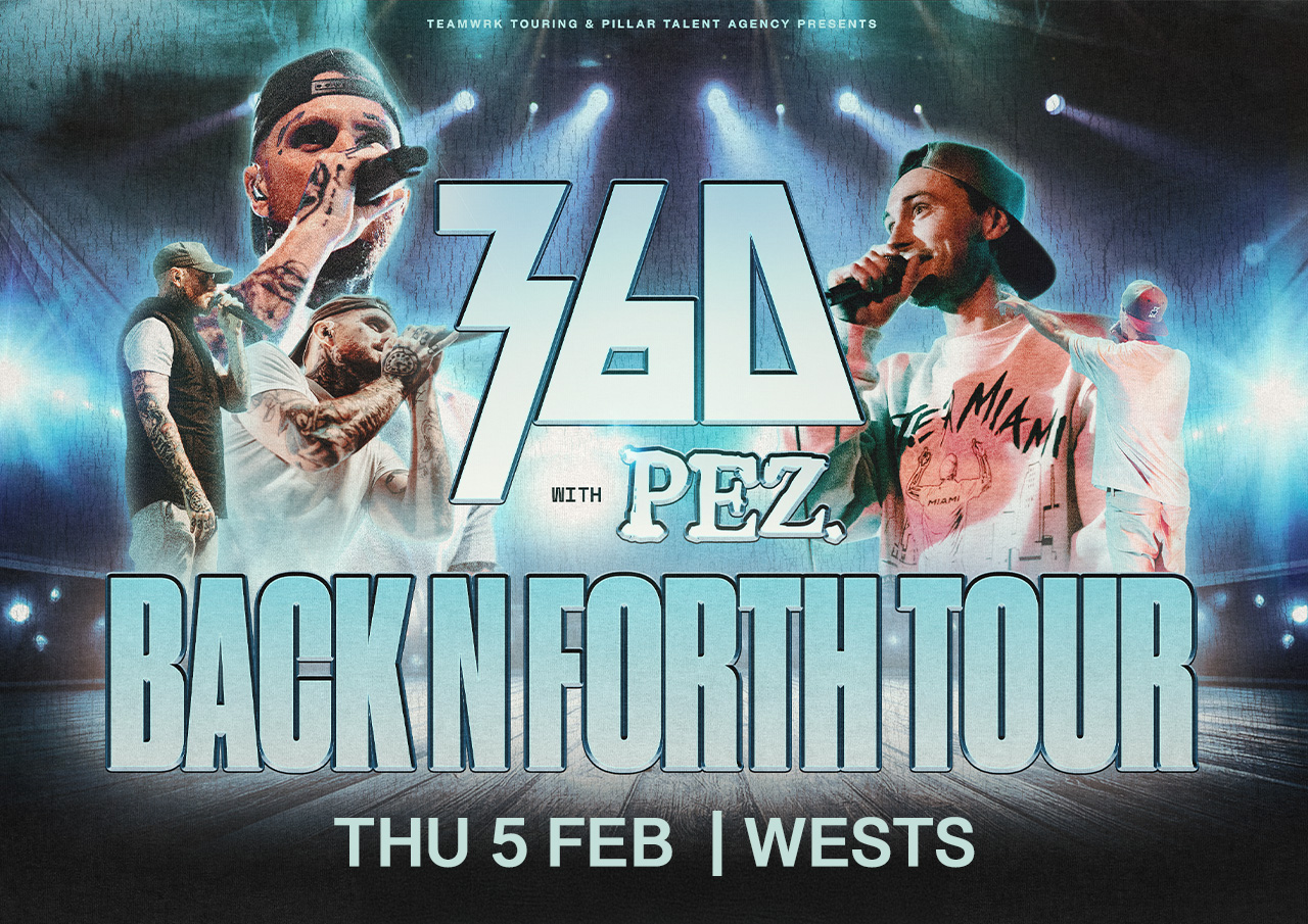 Following the sold-out Out Of The Blue capital city tour, ARIA Award-winning rapper 360 and longtime collaborator PEZ are hitting the road again — this time, taking it BACK N FORTH across regional Australia.